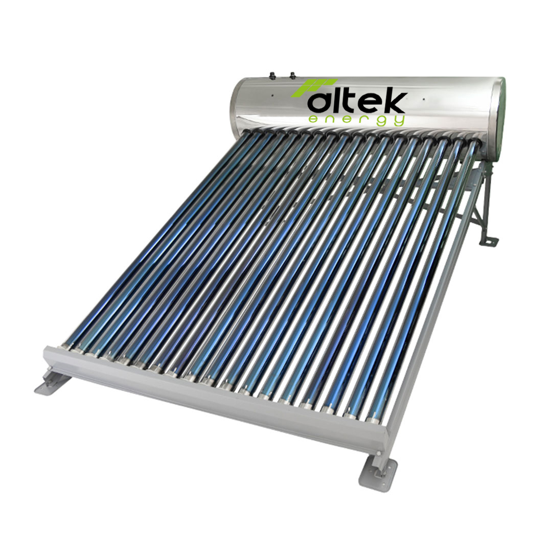 Calentador solar marca ALTEK con una capacidad de 393 litros y 36 tubos al vacío para suministro de agua con tinaco (baja presión); considerado para un servicio aprox. de 10 personas.